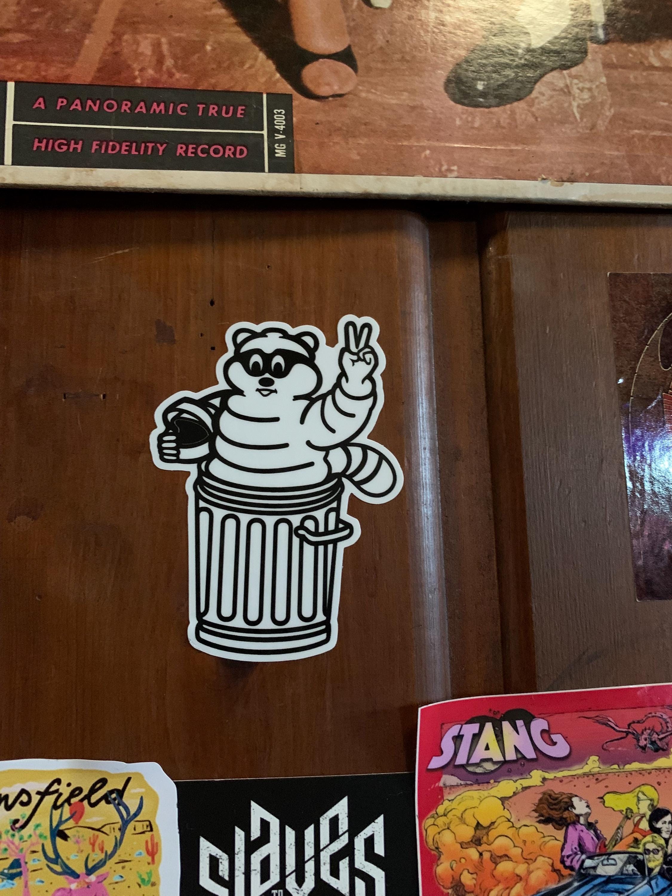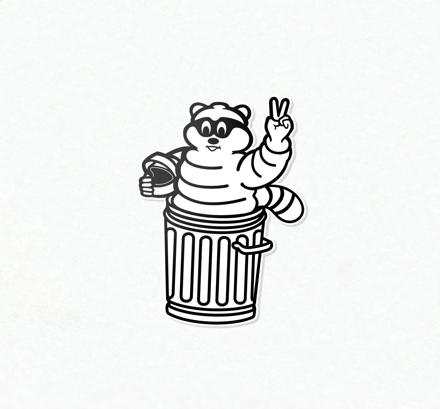 Tire motorcycle raccoon sticker inspired by the tire man icon. This vinyl sticker is 2.56" x 3.49" in full color.